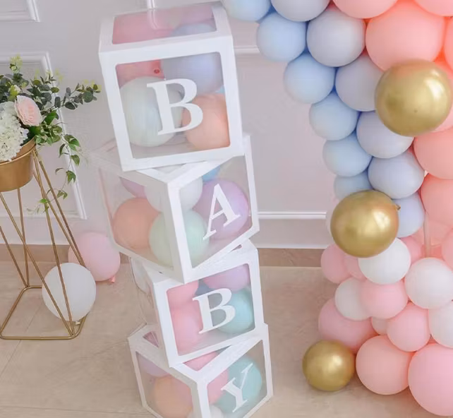 Bästa dekorationern till en babyshower! Våra babyboxar säljs i paket med bokstäverna "B, A, B, Y". Finns i färgerna vit, rosa och blå!