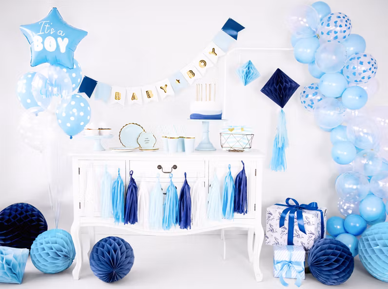 Fantastiskt vacker banner i färgerna, vit, blå och guld med texten BABY BOY! Passar perfekt på en babyshower eller dopfest!