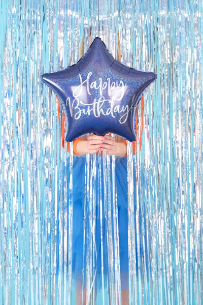 Folieballong i form av en blå stjärna med texten "Happy Birthday. Fylls med helium och pryds med vacker snöre.