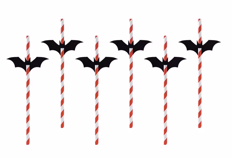 Halloweensugrör - röda med svarta fladdermöss på! En förpackning består av 6 stycken sugrör.