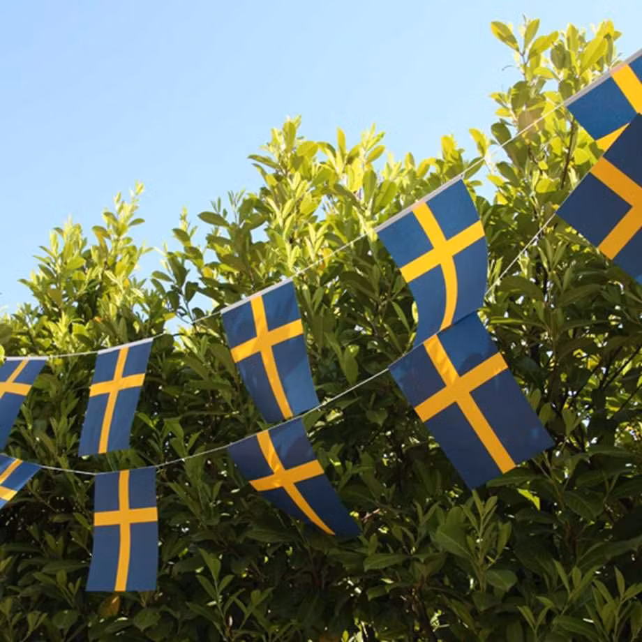 Banner med svenska flagga som motiv. Den passar utmärkt för tillfällen såsom studenten, examen, midsommar, kräftskivan och liknande.
