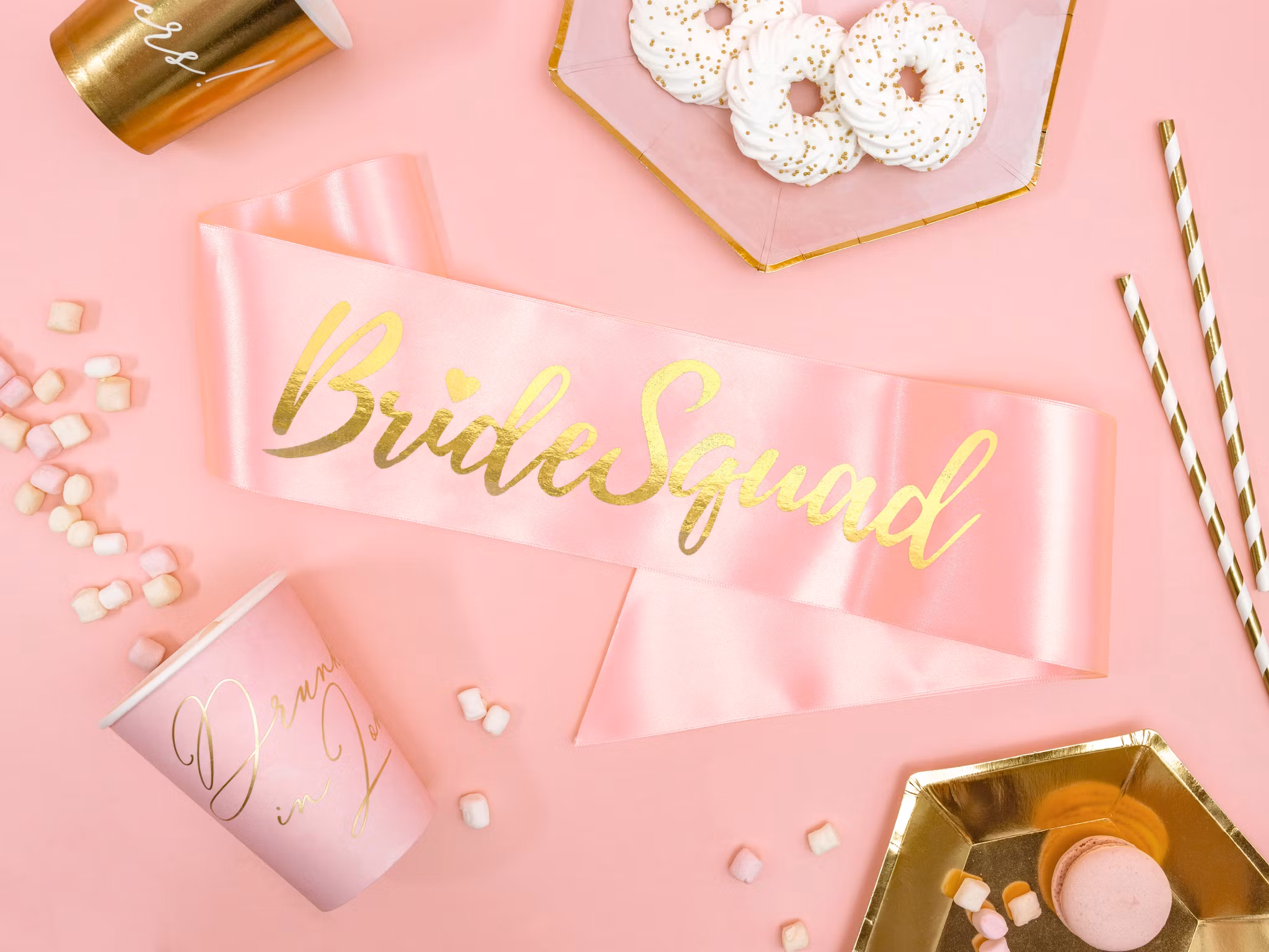 Sashband i färgen rosa med texten "Bridesquad" i skimrande guld.