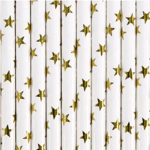 Vill du imponera på Nyårsafton eller varför inte till middagen på Julafton då har du hittat rätt!Vita sugrör med stjärnor i guld. Sugrören är tillverkade i biol