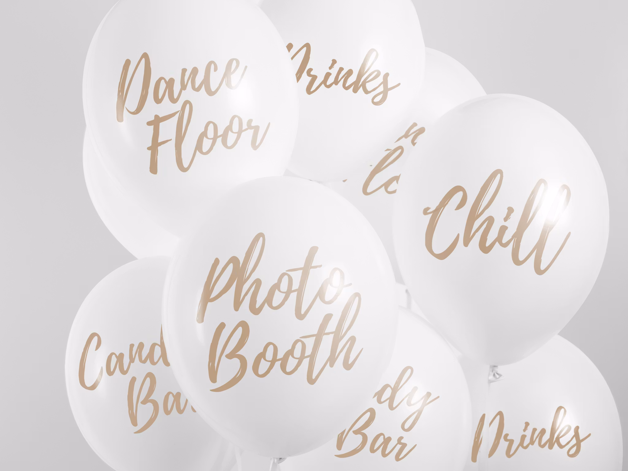 Vita ballonger med guldigt tryck. Det ultimata ballongkittet för den lyckade festen. Nu kan du på ett vackert och kreativt sätt markera ut godisbuffén, photo booth och dansgolvet med hjälp av ballongbuketter.